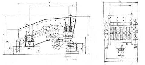 型號 | 大給料粒度 mm | 生產率 t/h | 偏心軸轉速r/min | 電機功率KW | 安裝傾角° | 機器重量 (不包括電機)kg | 料槽尺寸 | 機器外型尺寸 |